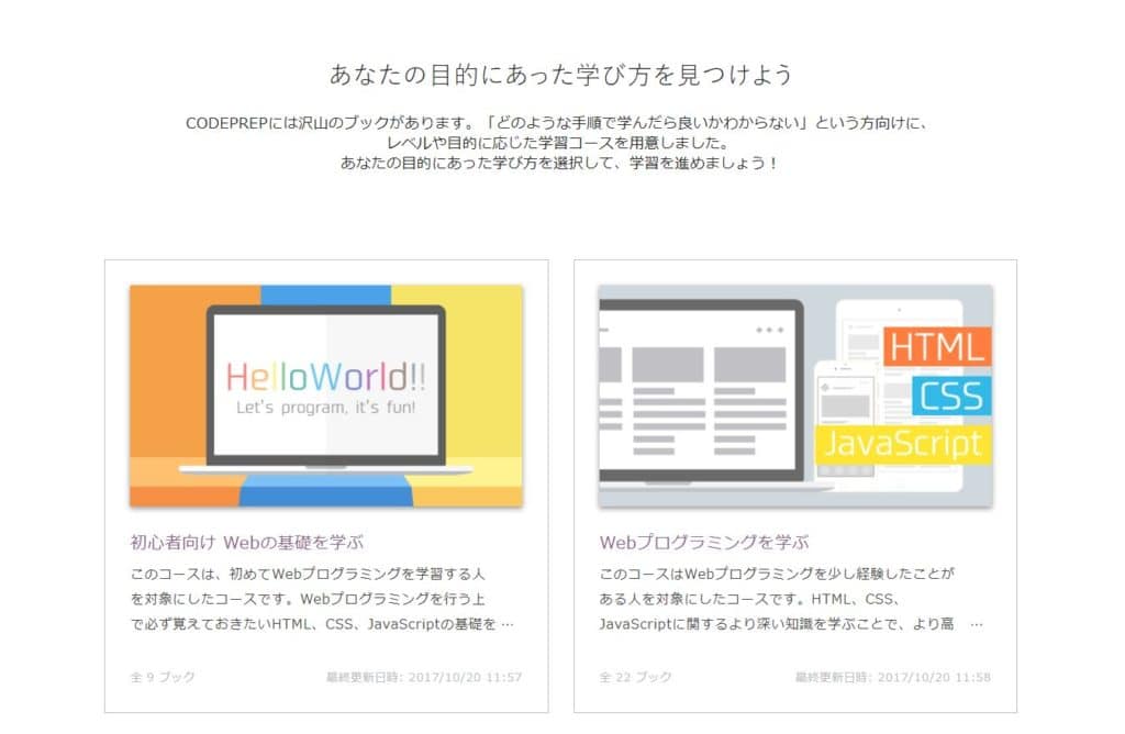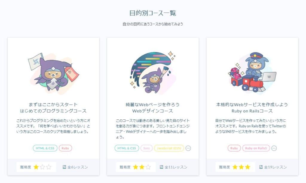 また、以下のように、目的別のレッスンまとめページもあります。コースに沿って学ぶことで、プログラミング学習がしやすくなるだけでなく、スケジュールも立てやすくなります。