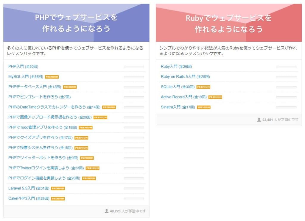 また、ドットインストールと同様、目的別のレッスンまとめページもあります。