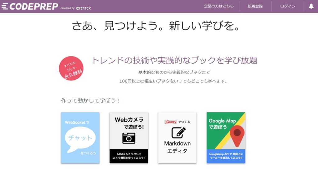 CODEPREPは、プログラミングを書いて動かしながら学ぶ実践型のプログラミング学習サービスです。言語の基礎解説だけでなく、作りたい機能・アプリをベースにしたコンテンツが多いことが特徴です。