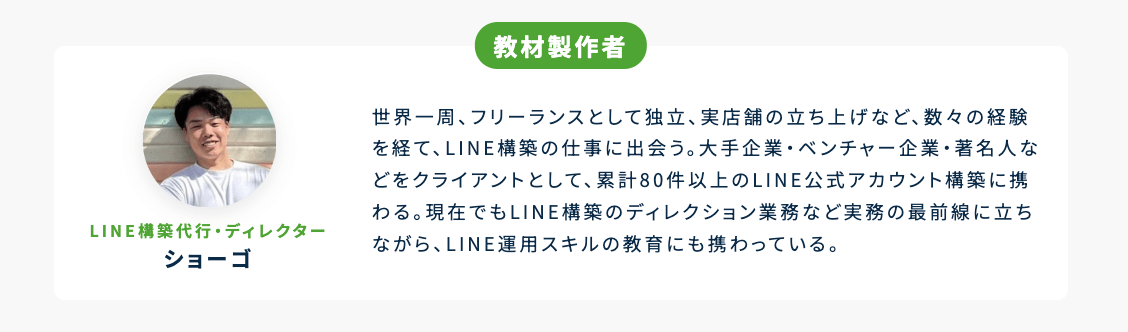 ↑豊富なLINE構築経験をもつ講師がカリキュラム制作を担当。