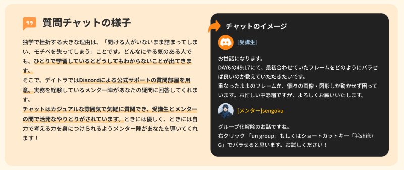 なかには、他のスクールを受講した後にデイトラで学び直すという方もいらっしゃり、それだけカリキュラムが充実しているのだろうと予想しました。