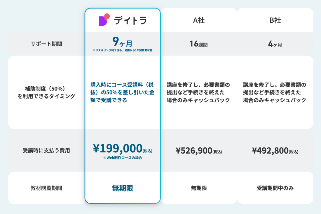 「リスキリング転職コース」では本記事で登場していたすがはらさんも受講しており、デイトラで人気の「Web制作コース」「Webデザインコース」「プログラミングコース」「Webマーケティングコース」の受講を通して新しいスキルが身につきます。さらに、Web業界で実績のあるメンターが、オンライン面談やチャットで個別に対応し、転職を手厚くサポートします。
