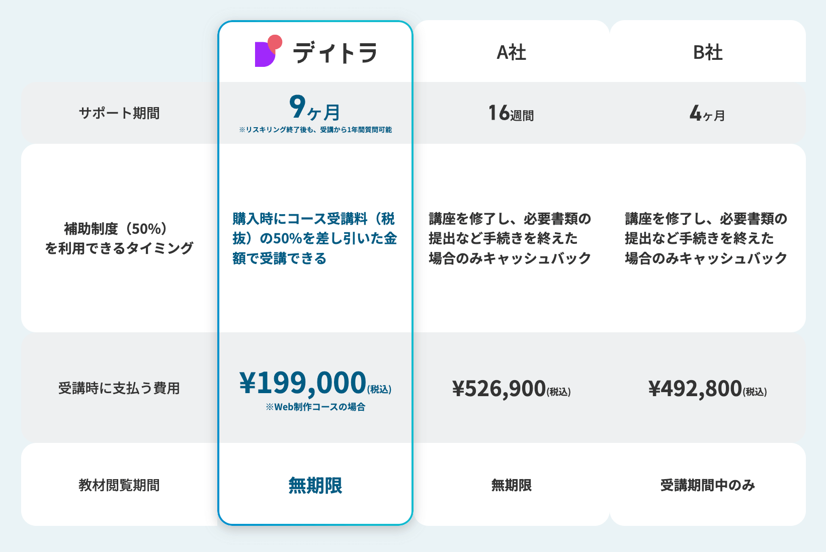 「リスキリング転職コース」では本記事で登場していたすがはらさんも受講しており、デイトラで人気の「Web制作コース」「Webデザインコース」「プログラミングコース」「Webマーケティングコース」の受講を通して新しいスキルが身につきます。さらに、Web業界で実績のあるメンターが、オンライン面談やチャットで個別に対応し、転職を手厚くサポートします。