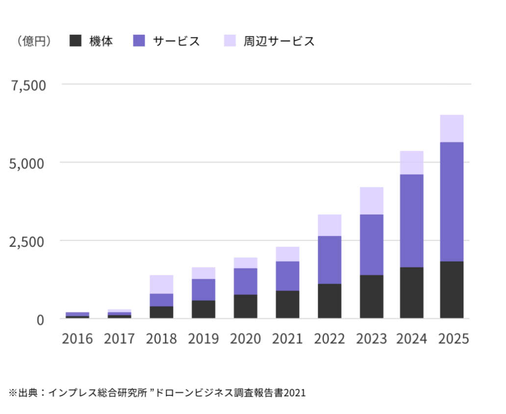 ↑ドローンの市場規模は2025年には6,500億円になると予測されている