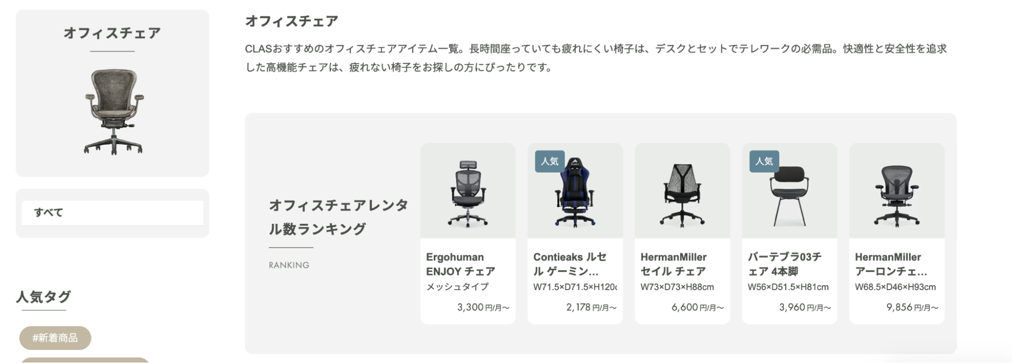 ↑CLASが提供する「オフィスチェア」のラインナップ