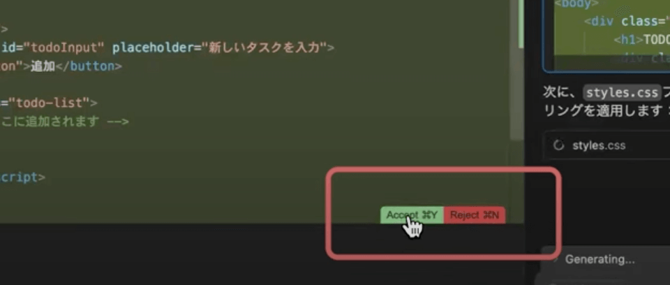 Cursorでは、AIが提案した内容に対して「Accept(承認)」または「Reject(却下)」を選ぶだけで、コーディングが進行します。