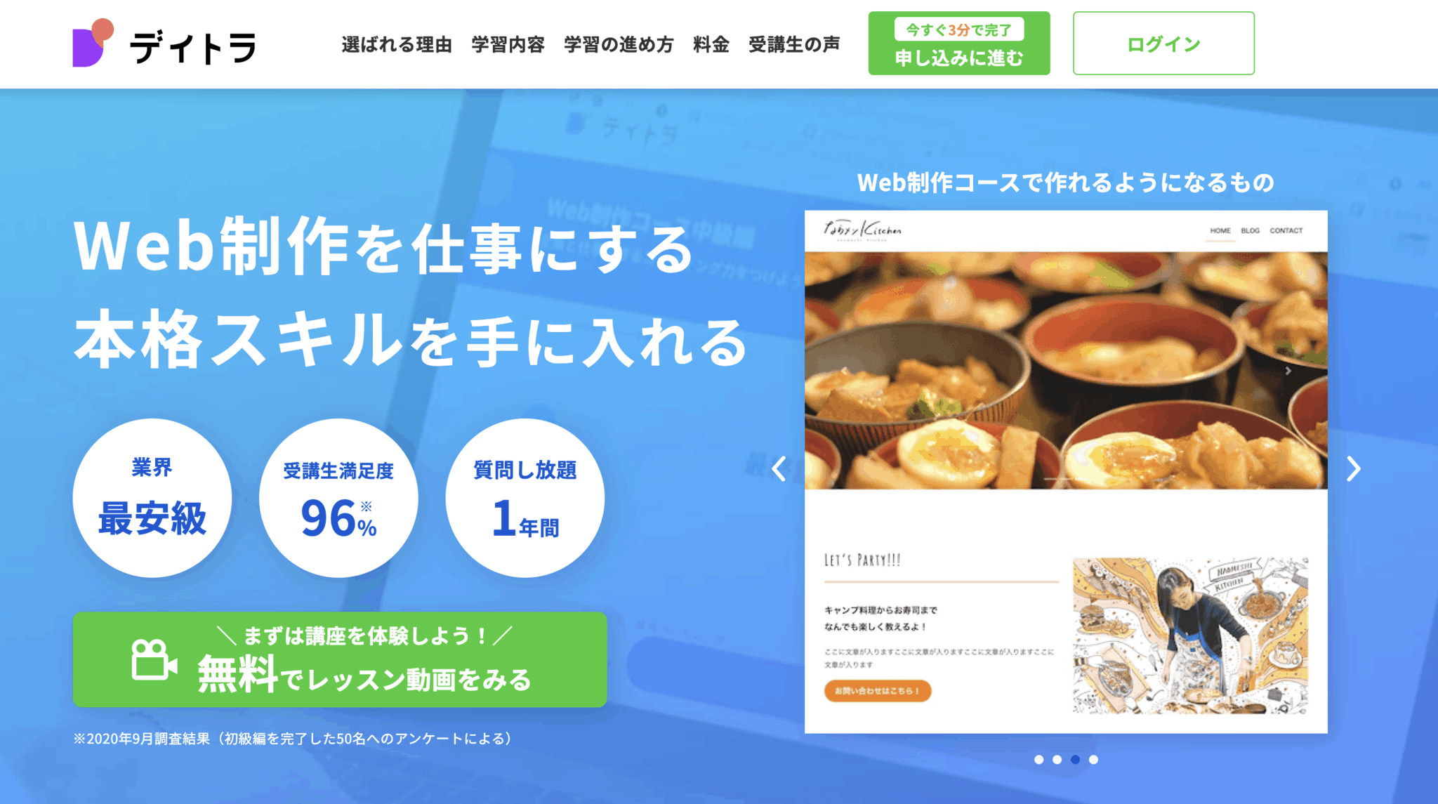 挫折させないメンター陣、アップデートされ続けて無期限で視聴できる講座内容、活発に活動しているオンラインの学習コミュニティなど、デイトラの魅力は多岐に渡ります。