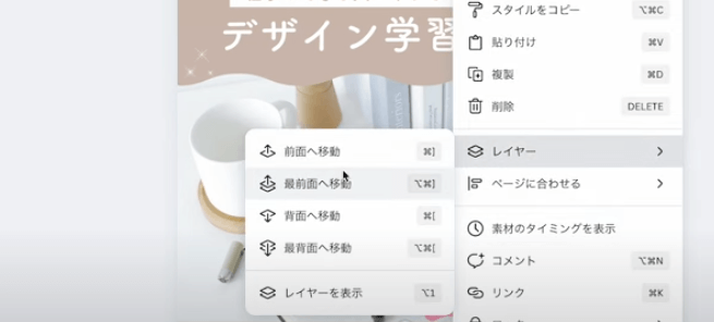 操作はシンプルで、重なり順を変えたい要素を右クリックし「最前面へ移動」や「最背面へ移動」を選ぶだけ。