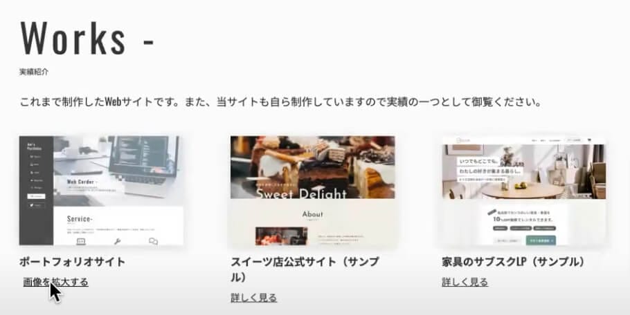 | <h3 class=”works__item-name”>ポートフォリオサイト</h3> <a href=”#” class=”works__item-link”>画像を拡大する</a> |