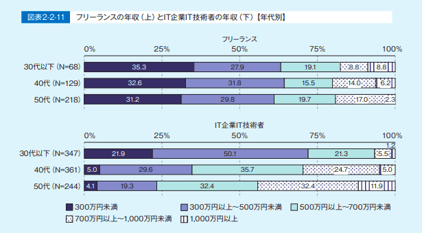 フリーランスエンジニアは30代以下でも高収入の割合が大きい