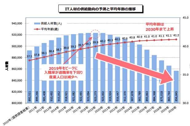 『IT人材の最新動向と将来推計に関する調査結果』によると、IT人材の供給量は2019年をピークに減少し、IT人材の入職率が退職率を下回っていくとされています。