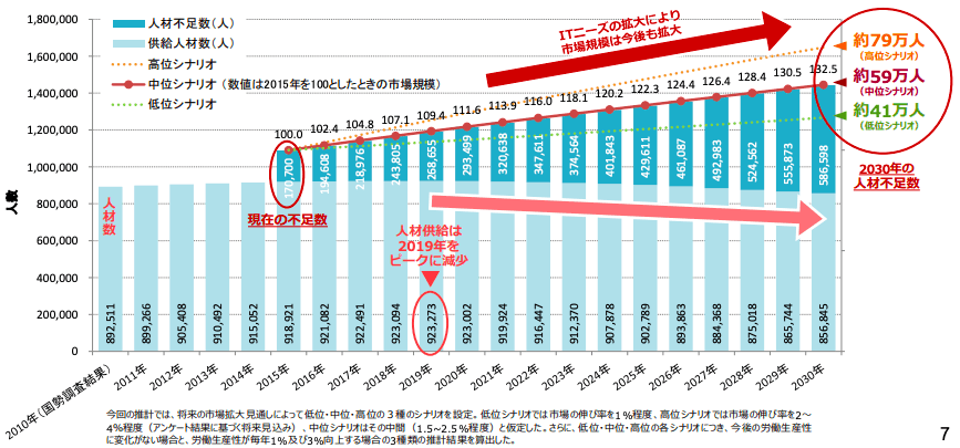 その結果、IT人材の不足規模は2030年までに約59万人となり、人材不足は今後ますます深刻化していくとされているのです。