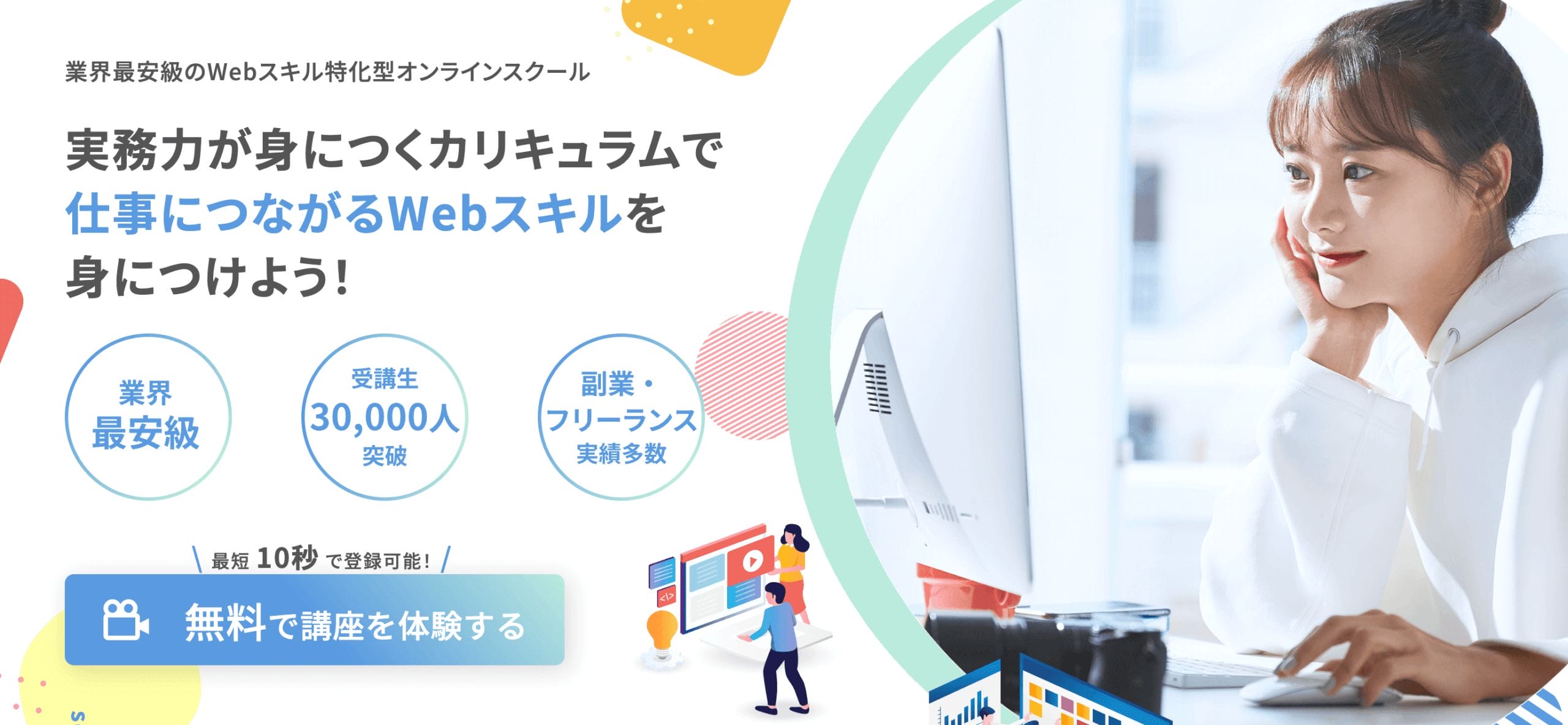 Web制作やWebデザイン、Shopifyなどの多彩なコースがあり、プロのスキルを身につけられます。