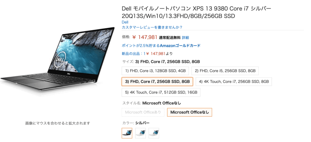 価格:メモリ8GB / Core i7 / 256GB SSD で¥147,981