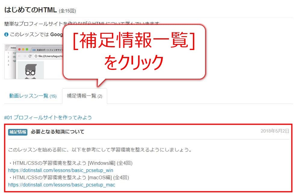 はじめてのHTMLの「補足情報一覧」の例: