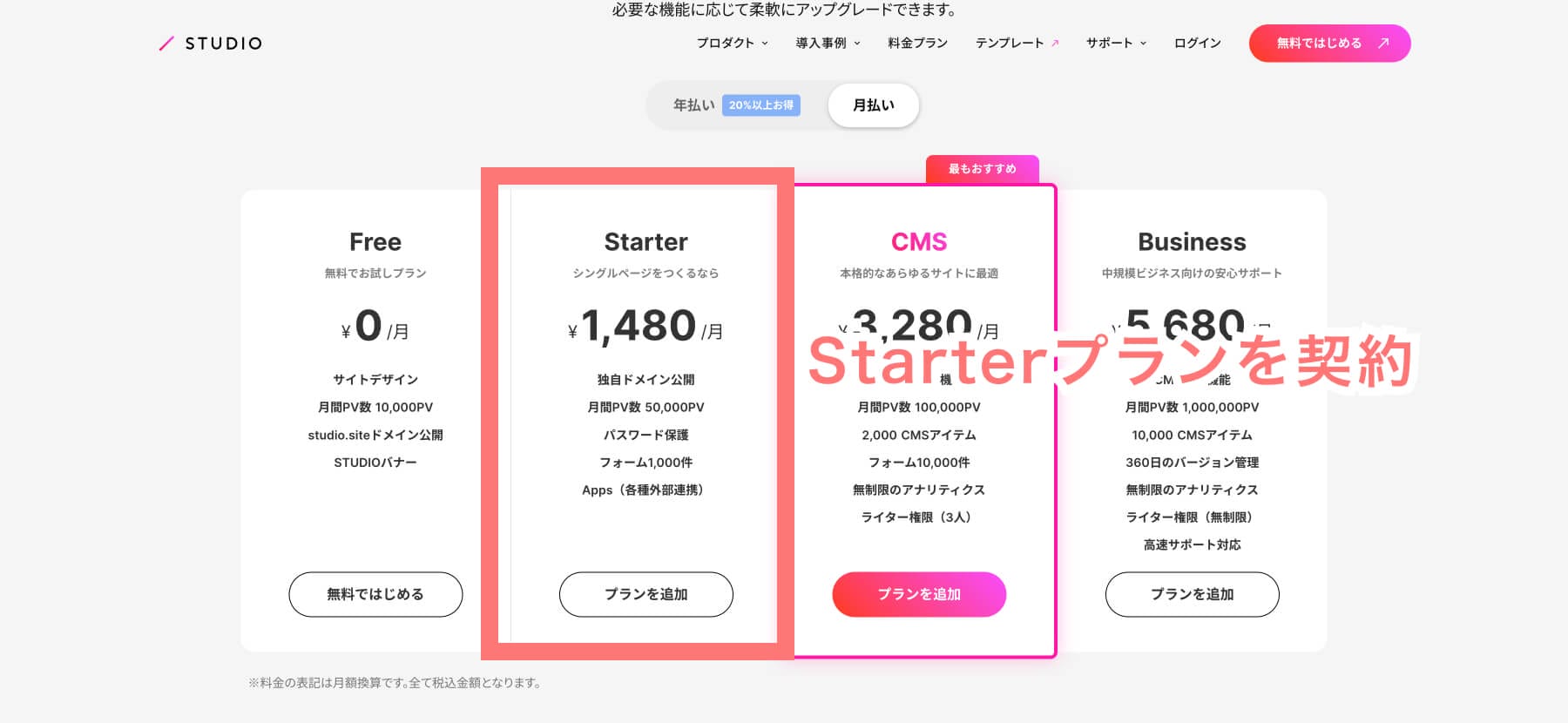 まずはSTUDIOにログインし、対象サイトをStarterプランに登録してください。