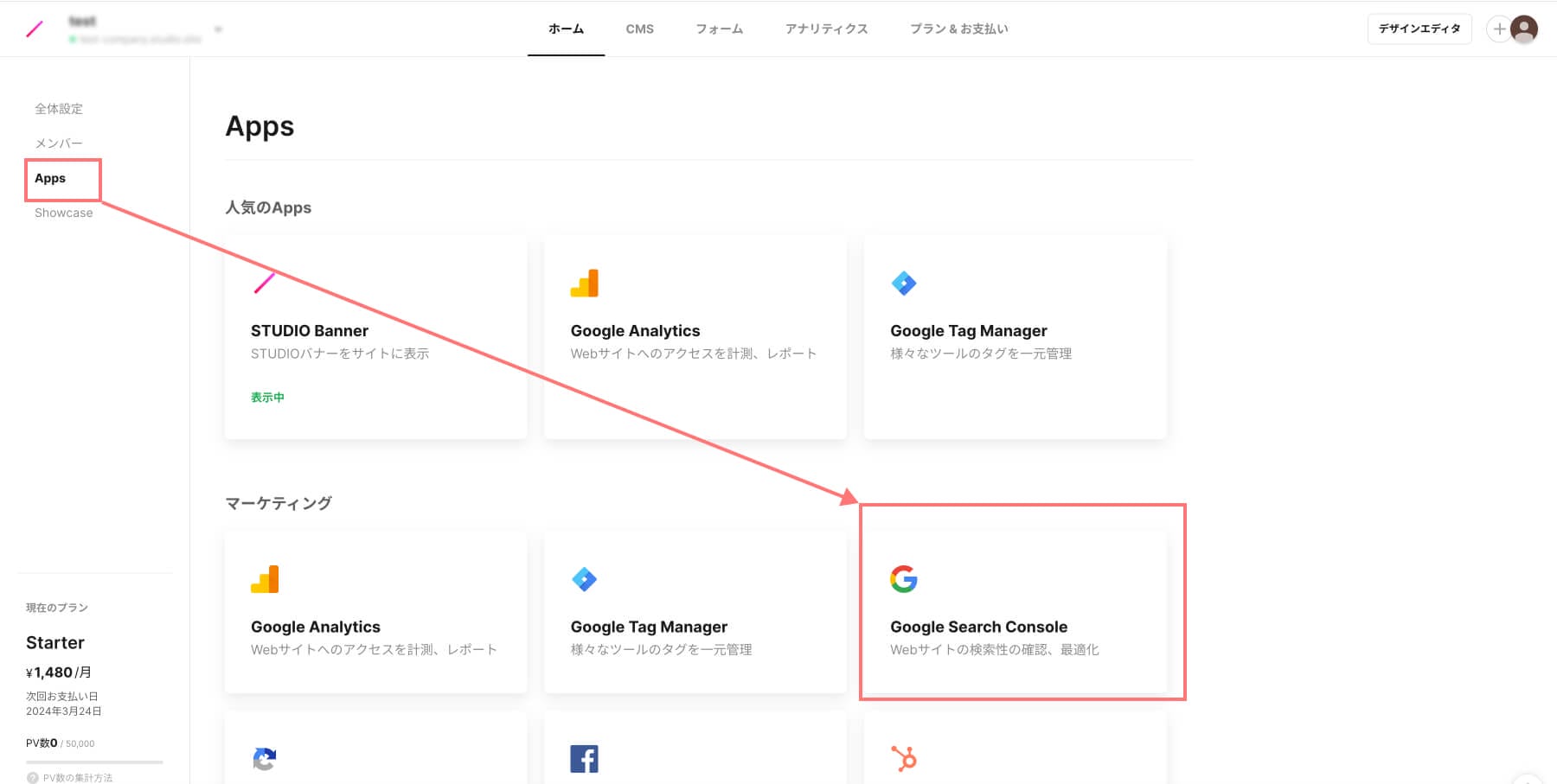 サイドメニューのAppsからGoogle Search Consoleを選択します。