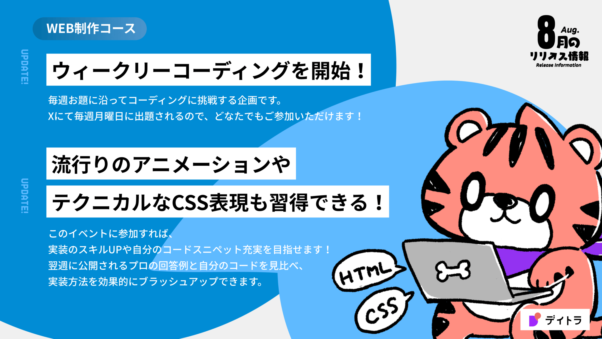 今回は、『Instagram運用代行エキスパートコース』のリリースやウィークリーコーディング開始、Shopifyコースのアップデートの先行情報をお届けします。この夏、新たなWebスキル習得に挑戦してみてはいかがでしょうか。