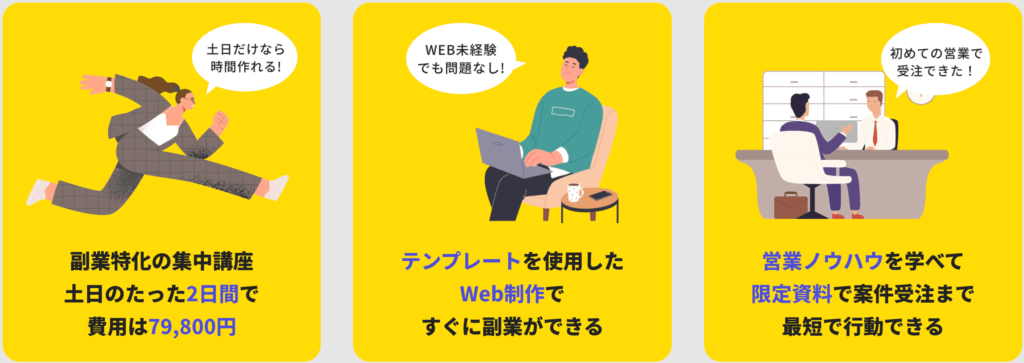 たった2日で学習を終えることも可能なため、忙しい社会人にとってノーコードWeb制作は副業にぴったりです。