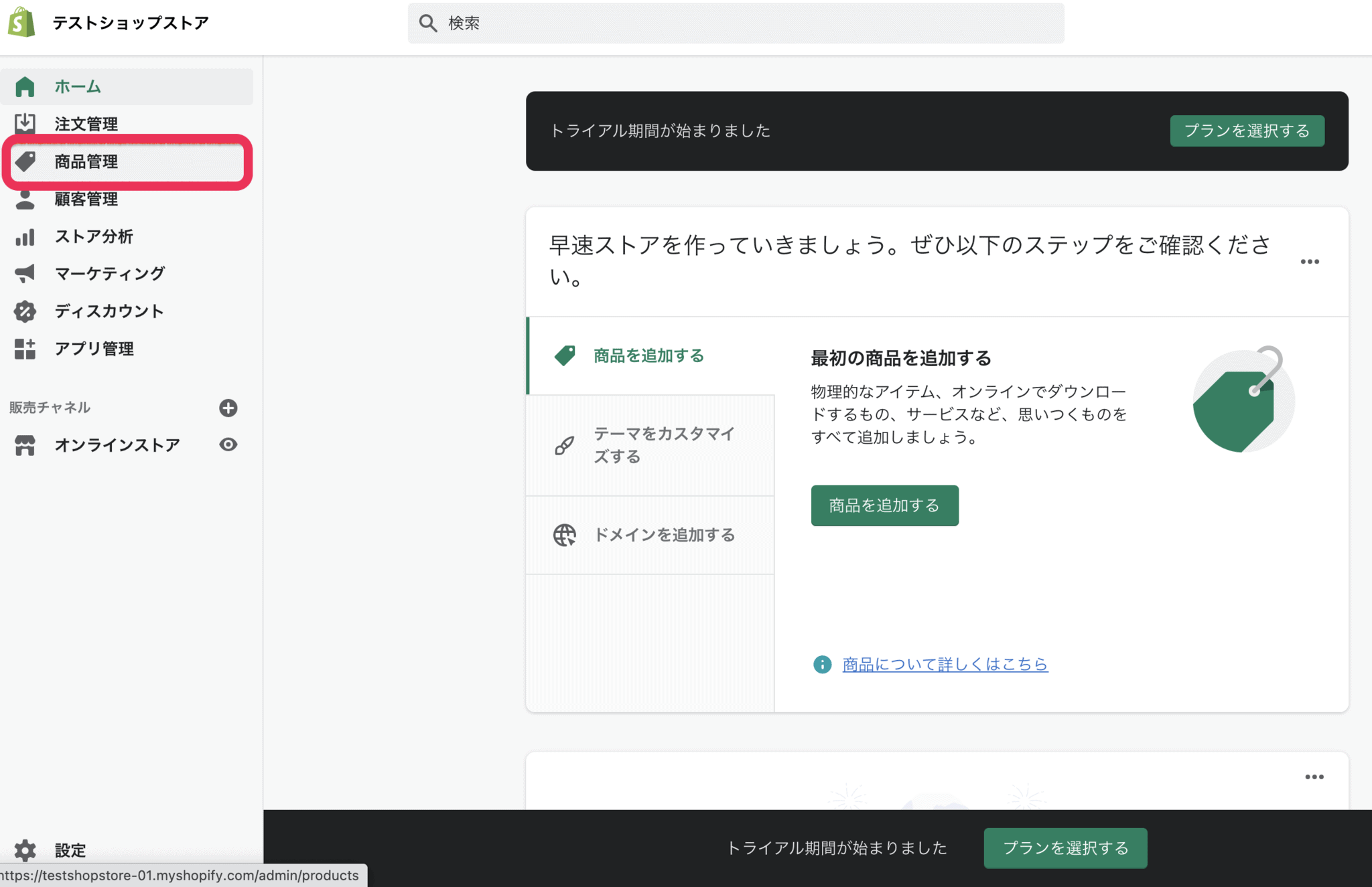 次にShopifyストアの管理画面の扱い方を覚えていきましょう。
