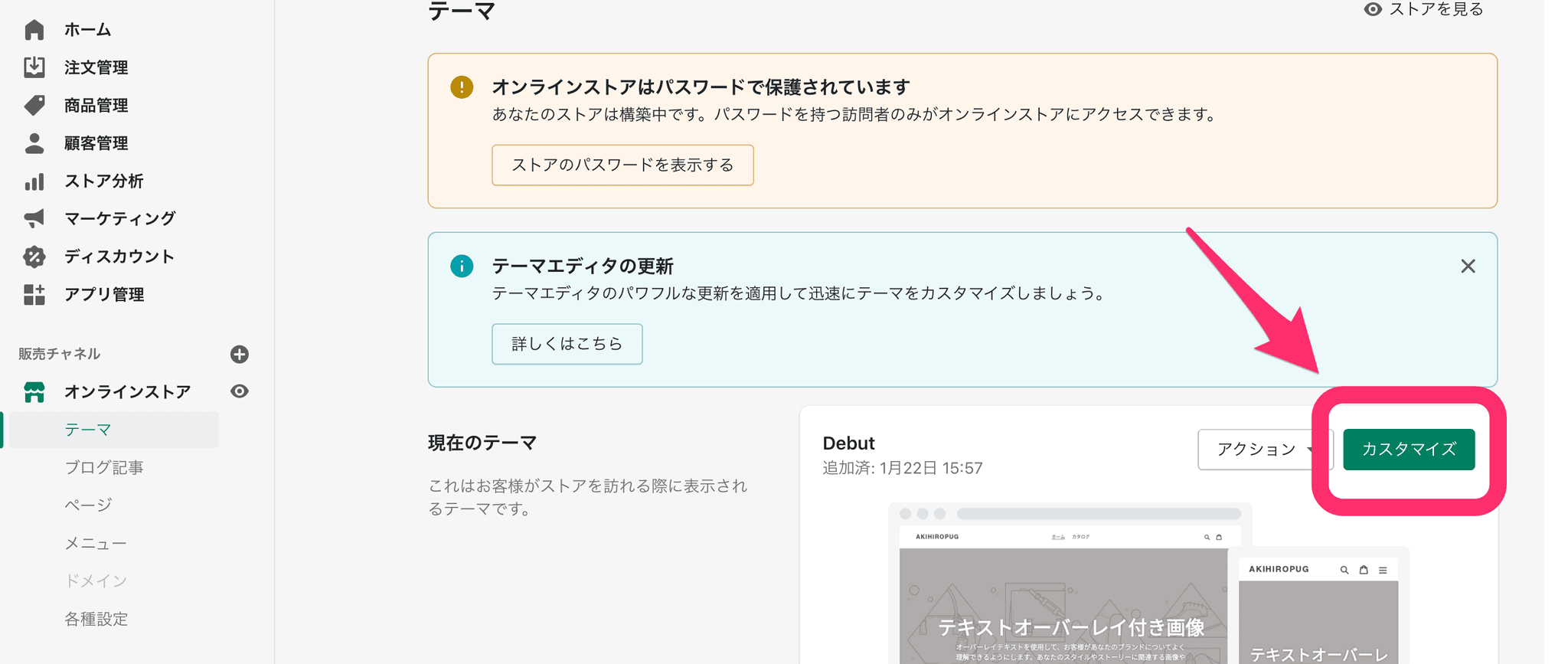 Shopifyストアの管理画面より、左の項目「オンラインストア」から「テーマ」をクリック。表示されたページから「カスタマイズ」をクリックすると、Shopifyストアのカスタマイズページに移動します。