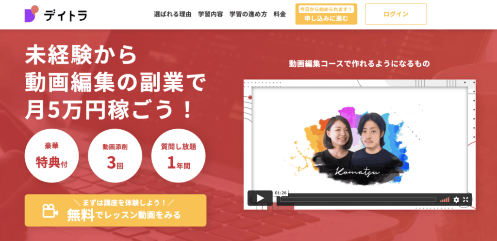 当メディアを運営するデイトラでは、動画編集者として未経験から仕事を取るために必要なスキルやノウハウが学べるオンラインスクールの「デイトラ動画編集コース」を運営しています。