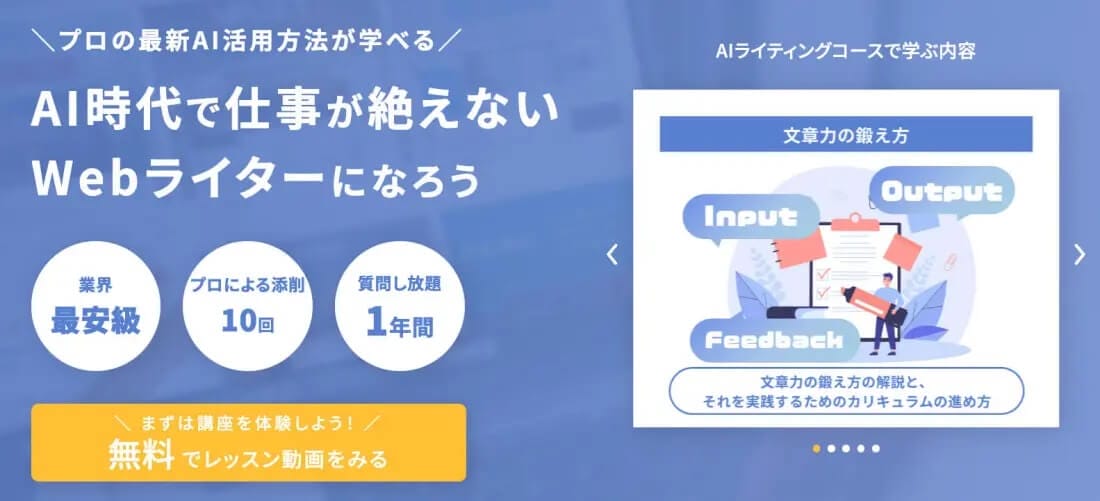 最大の特長は、全10回のプロ添削と1年間の質問サポート。独学では見落としがちな癖をプロの視点で改善していきます。さらに、これからの時代に必須のAI活用術も網羅。