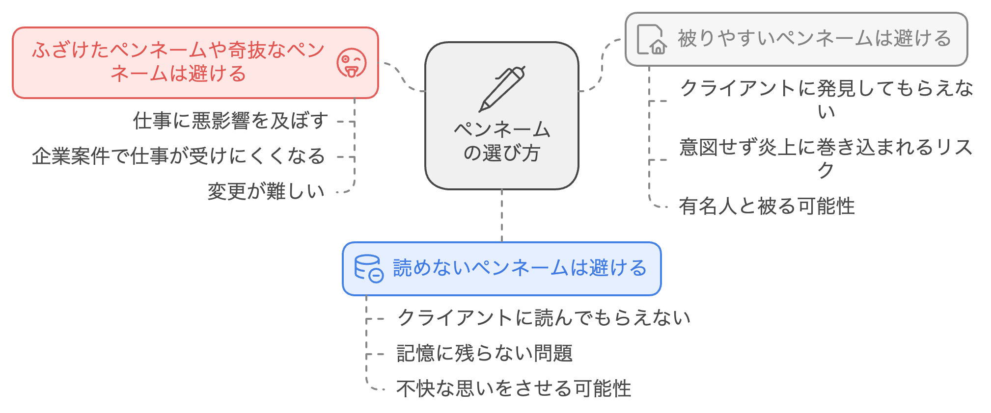 - 企業案件で仕事が受けにくくなる: 特に、企業のWebサイトや広告などのライティング案件の場合、クライアントのブランドイメージに合わないペンネームは避けましょう。