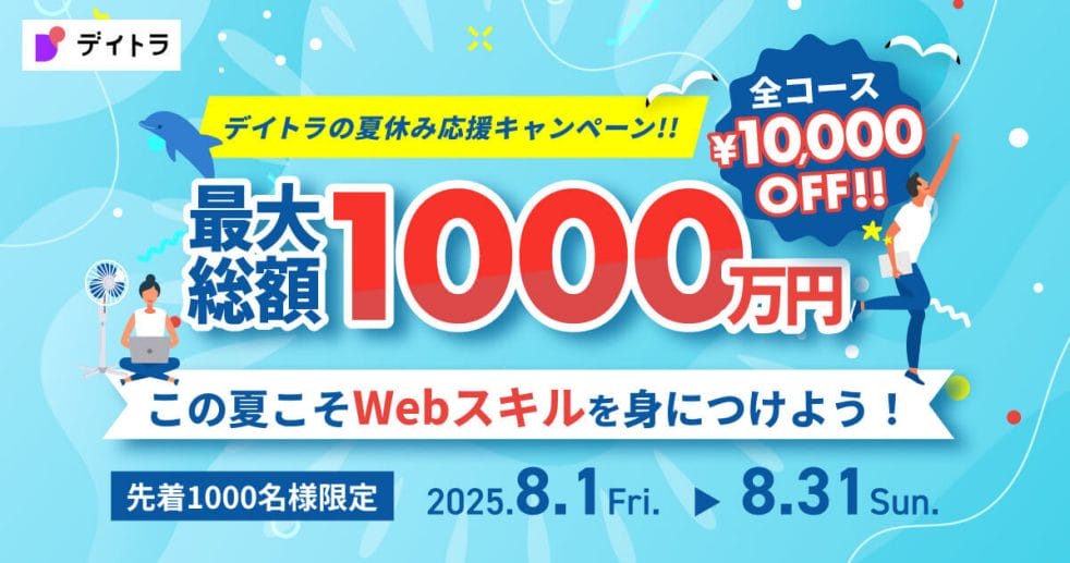 日頃の感謝の気持ちをこめて、2025年8月1日から8月31日にかけて、デイトラ全コースを対象に先着1000名様限定の受講料1万円引きキャンペーンを開催いたします!