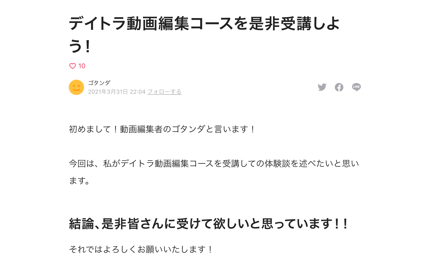 ここからは、デイトラ受講生が自身のブログやnoteで書いてくれた記事をもとに、デイトラ動画編集コースの評判や受講生の実績を紹介していきます。