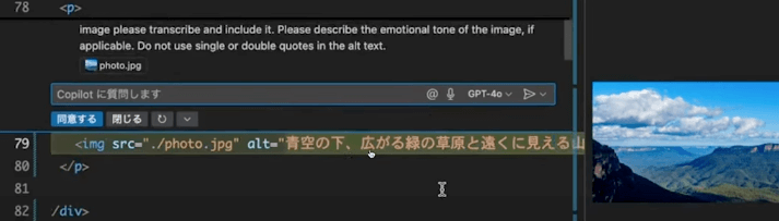 VS Codeでは、最新のアップデートにより、画像の内容をAIが理解して自動で適切な説明文(alt)を提案してくれる機能が追加されました。