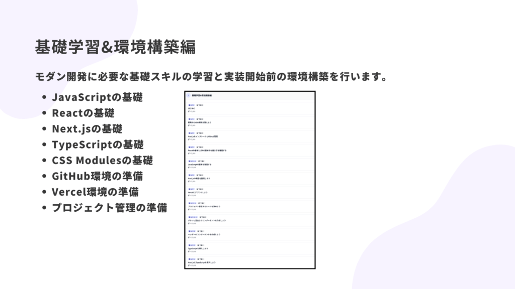 まずはモダン開発に必要な基礎知識と開発環境を徹底的に固めます。JavaScriptの重要構文の復習から、React・Next.js・TypeScriptの基礎を学習。