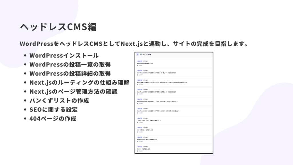 WordPress以外の選択肢として人気の高い国産ヘッドレスCMS「microCMS」への切り替え方法や、昨今トレンドのCSSフレームワーク「Tailwind CSS」での実装方法を学びます。
