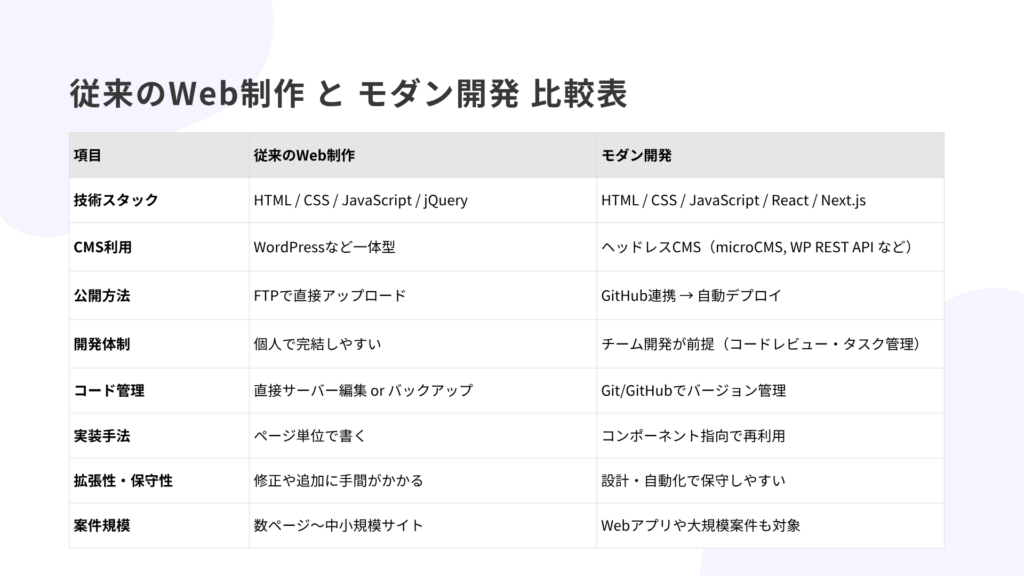 ここからは、モダン開発が従来のWeb制作と比べてどんな特徴を持つのか、
