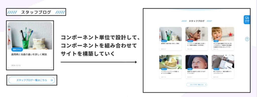 モダン開発ではその考え方がさらに進化し、サイト全体をボタンやカードといった小さな「部品(コンポーネント)」の集まりとして設計するのが基本です。