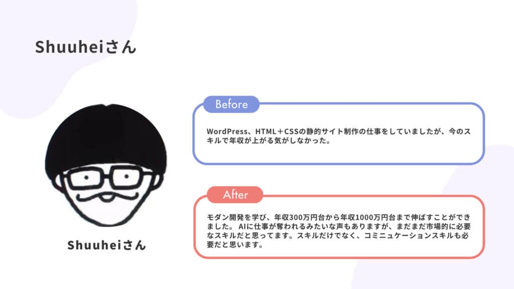 AIに仕事が奪われるという声もありますが、Shuheiさんが証明するように、コミュニケーションスキルとモダン開発スキルを兼ね備えた人材は、まだまだ市場で強く求められています。